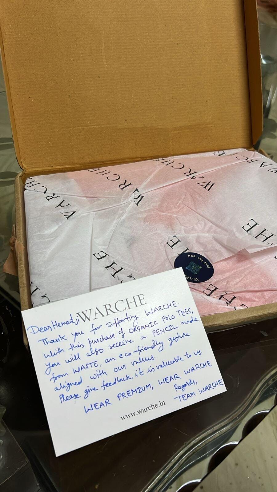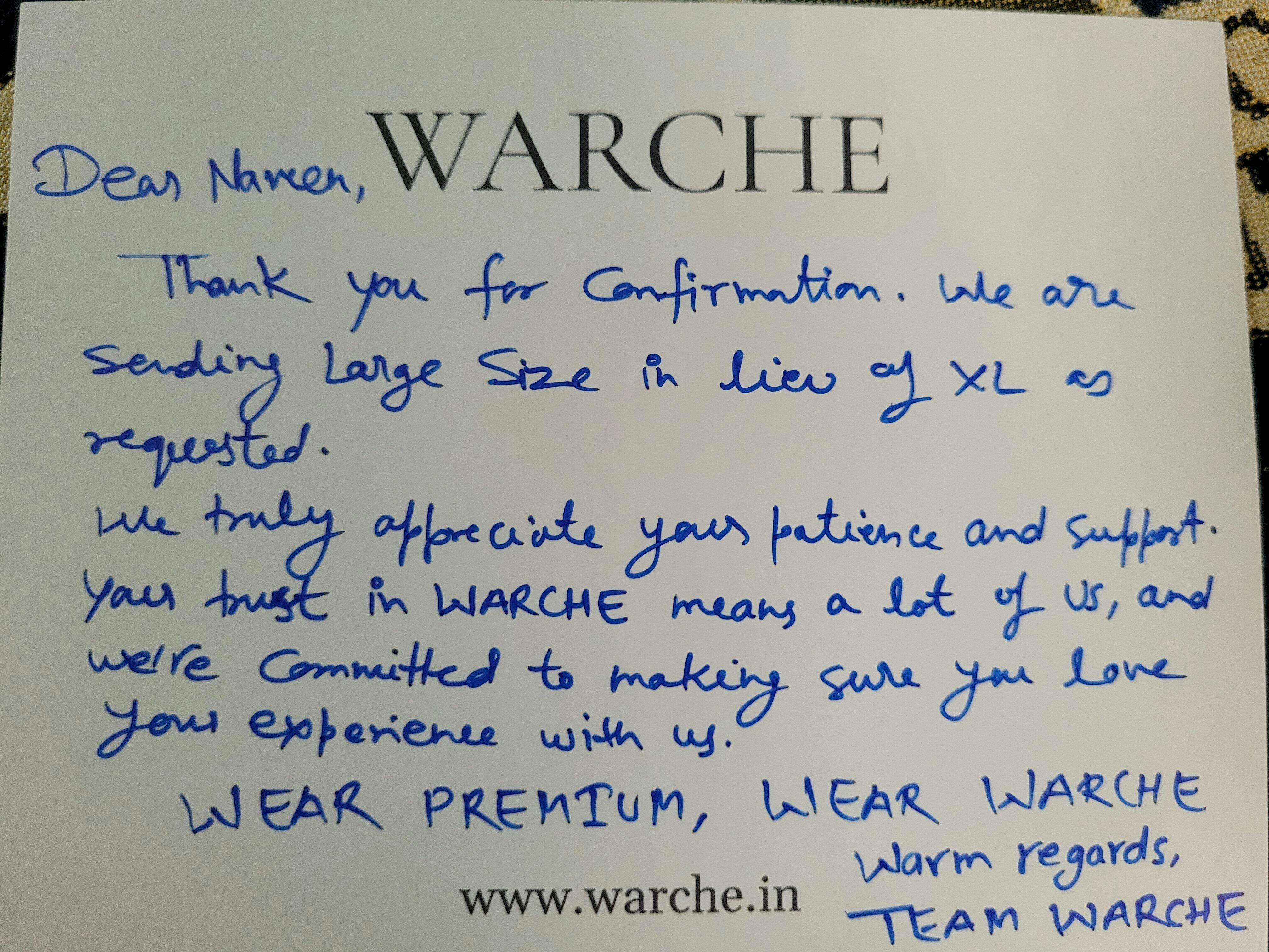 I purchased a Polo T-shirt in XL size from WARCHE, but it turned out to be a little big. I emailed them for a size exchange and was really impressed with their prompt and smooth response. The fabric is extremely soft and feels premium on the skin. The thank-you card included in the package was a lovely and thoughtful touch, which made the experience even better. Truly happy with both the product and the service!